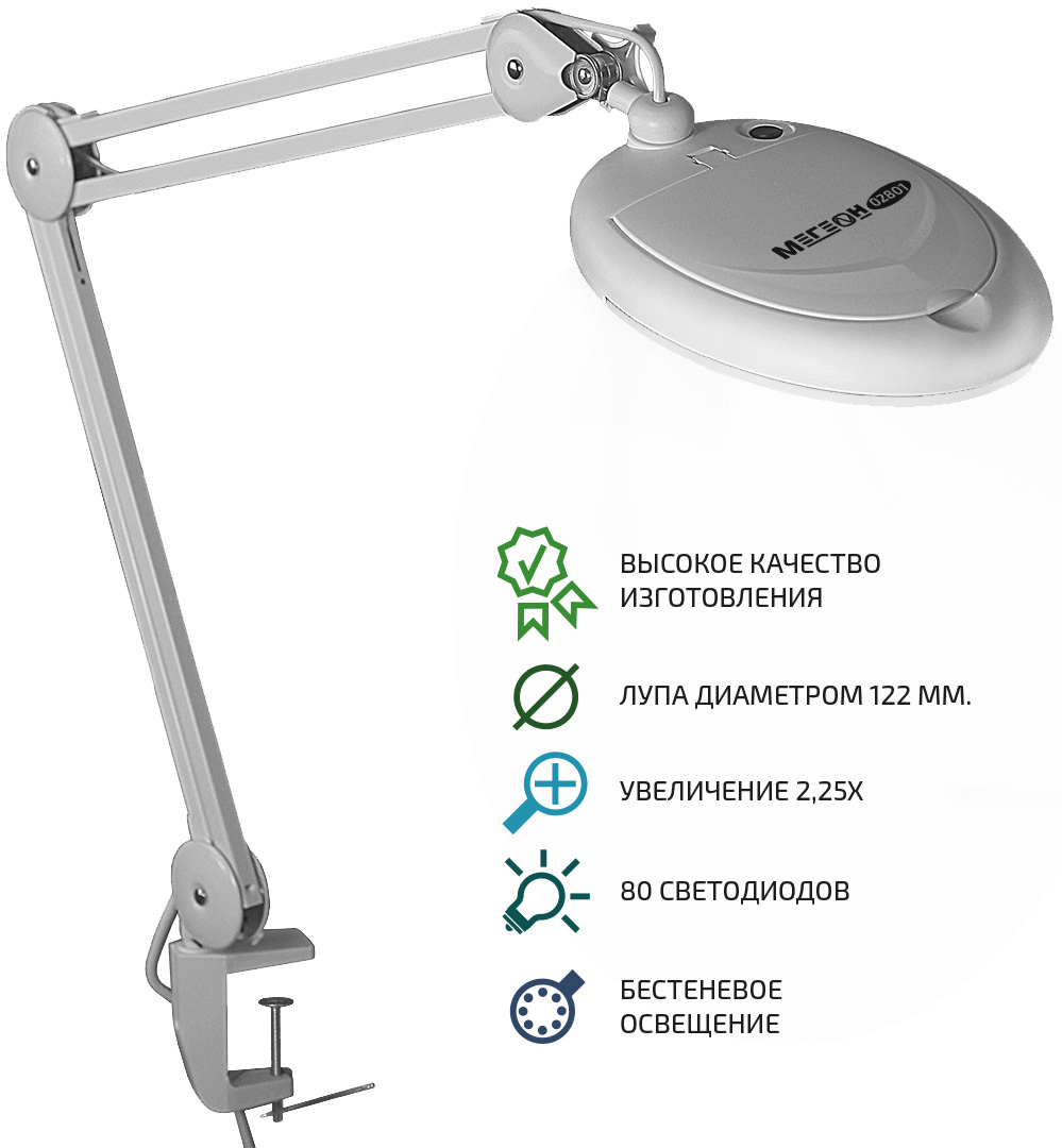 Сочетает в себе: эргономичную форму, равномерную подсветку и высокую степень увеличения. Для установки изделия в комплекте предусмотрена струбцина. 80 ярких светодиодных элементов. Отсутствует мерцание, не раздражает глаза. Продолжительный срок службы.